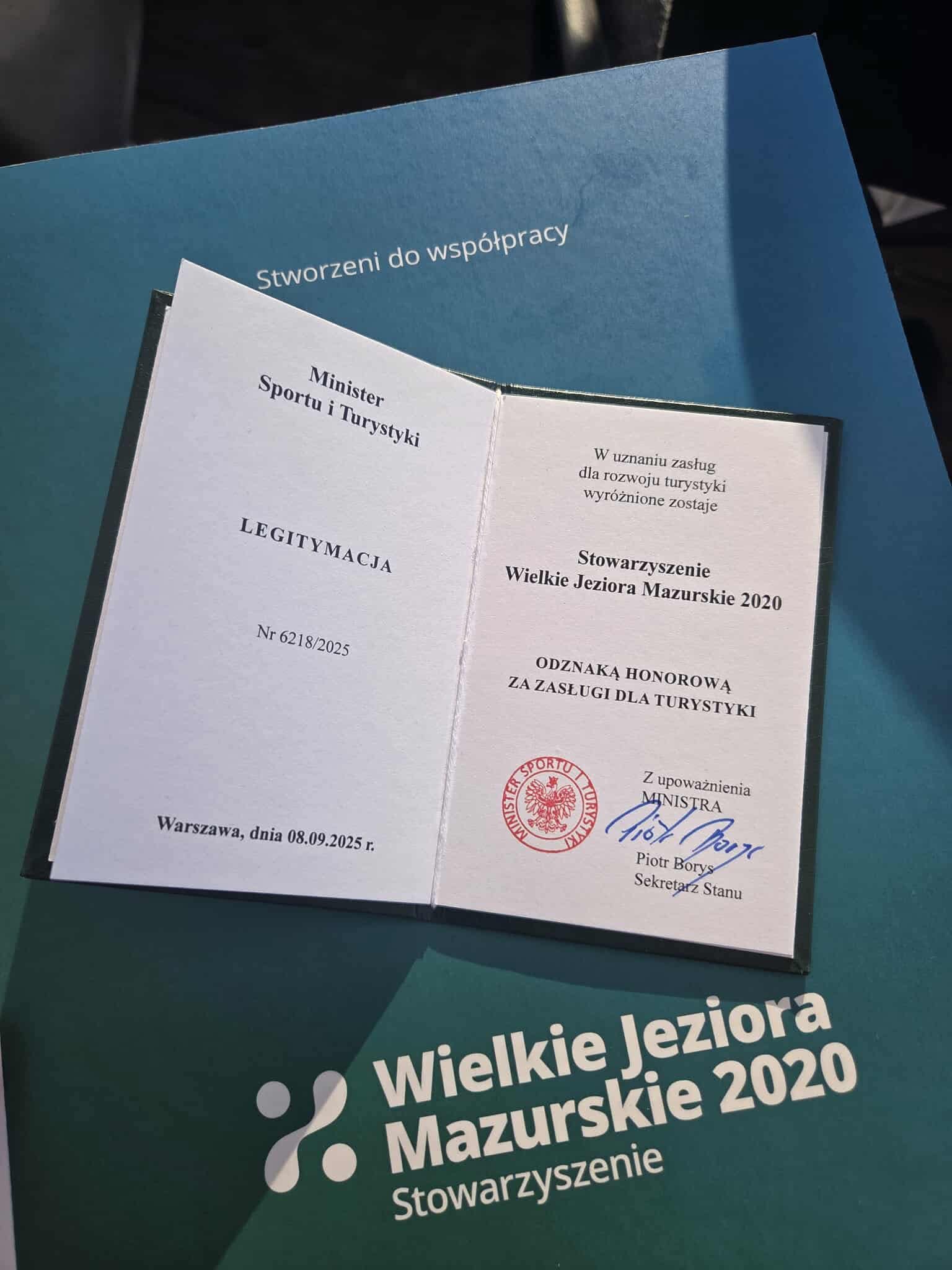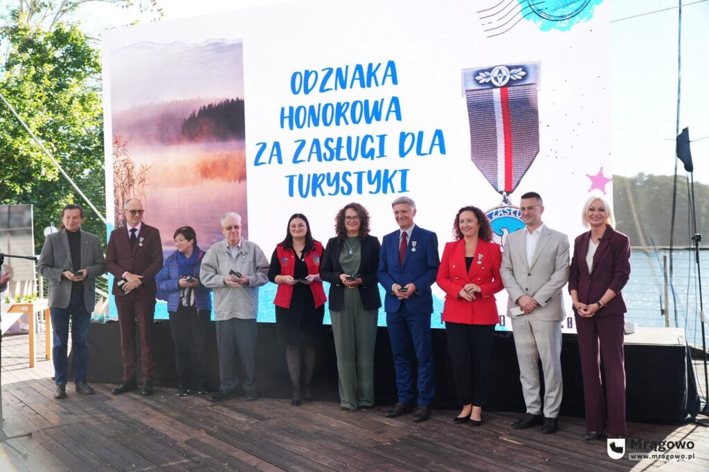 Hasło tegorocznych obchodów Dnia Turystyki to „Turystyka i zrównoważona transformacja” i ma zwracać uwagę na aktualne wyzwania oraz kierunki rozwoju. Podczas tego wydarzenia uhonorowano osoby i organizacje zasłużone dla rozwoju turystyki w Polsce i w regionie. Wśród nich znalazło się Stowarzyszenie Wielkie Jeziora Mazurskie 2020. Odznakę z rąk Marszałka Województwa Warmińsko – Mazurskiego, Pana Marcina Kuchcińskiego w imieniu samorządów tworzących Stowarzyszenie odebrali Pan Jakub Doraczyński – Burmistrz Mrągowa, Członek Zarządu Stowarzyszenia oraz Agnieszka Kombel – Gawlik, Dyrektorka Zarządzająca Stowarzyszenia.